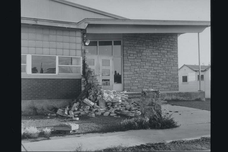 Collapse of stone entry at elementary school, Hebgen Lake, Montana (1959)