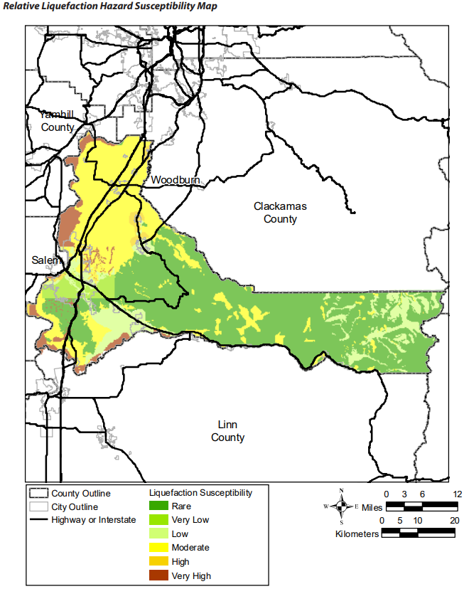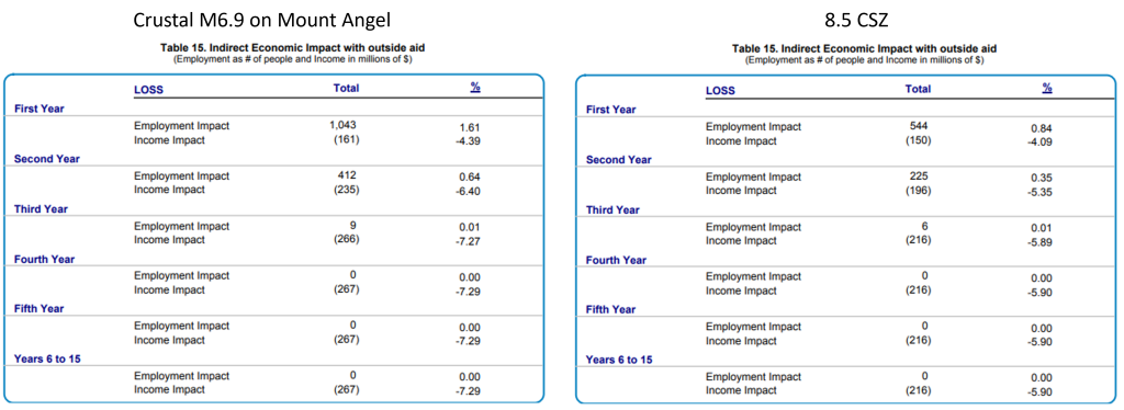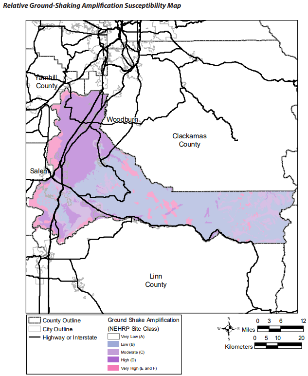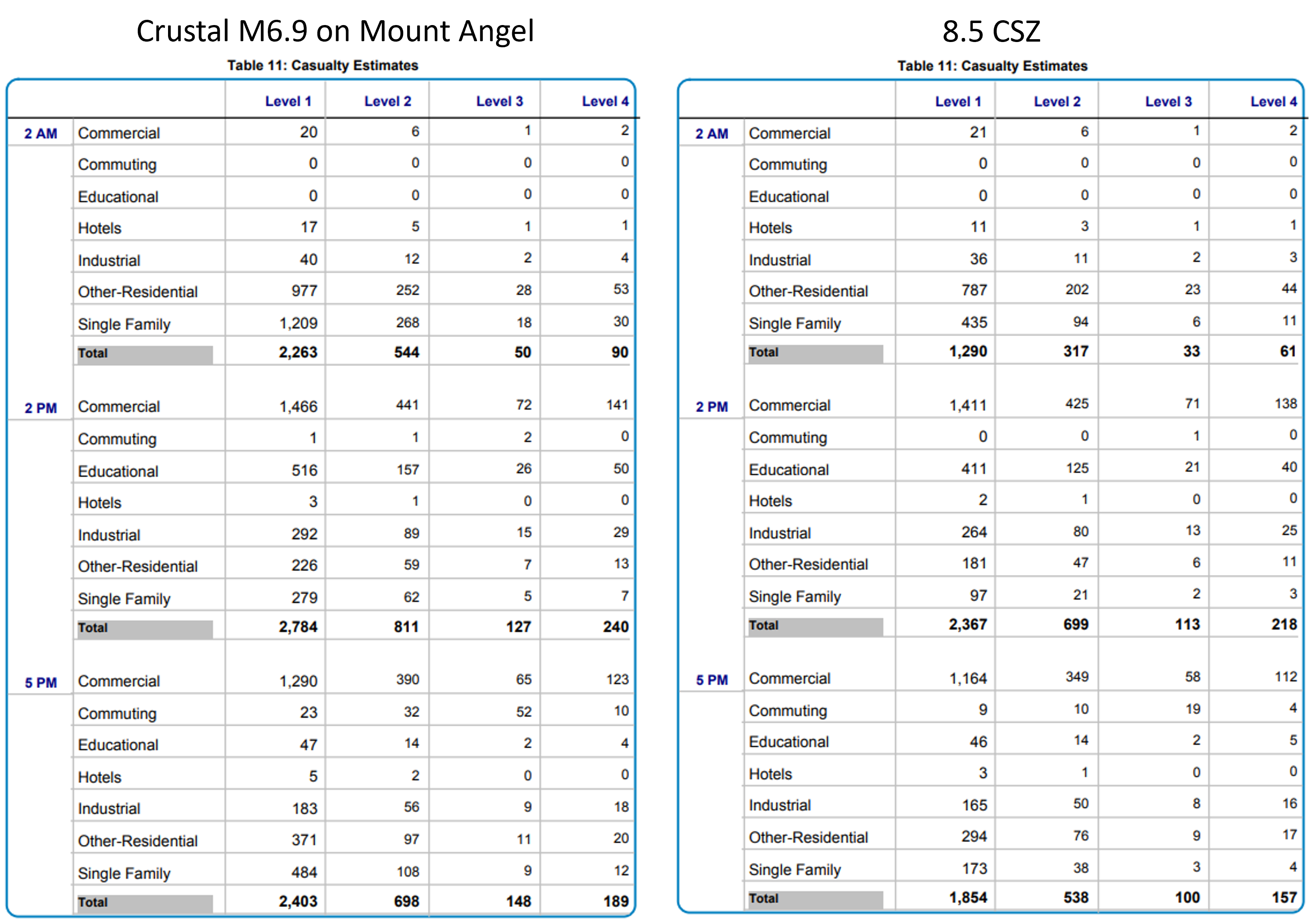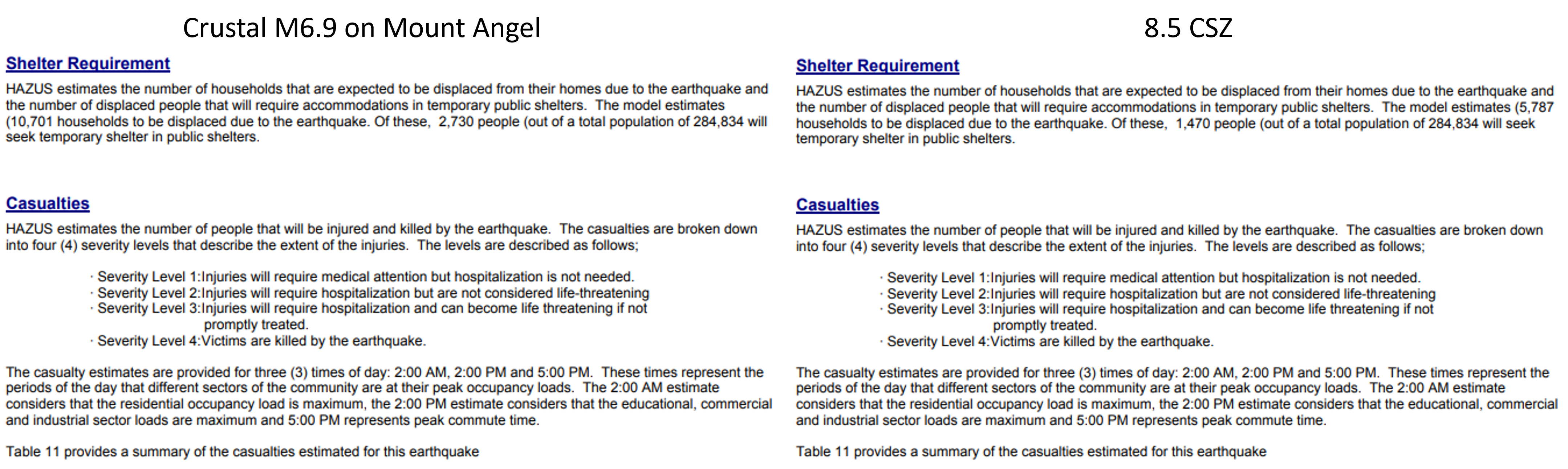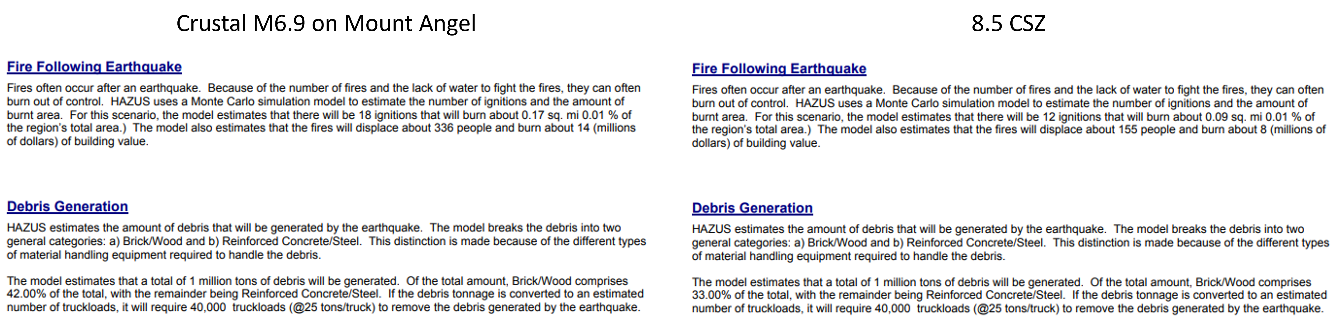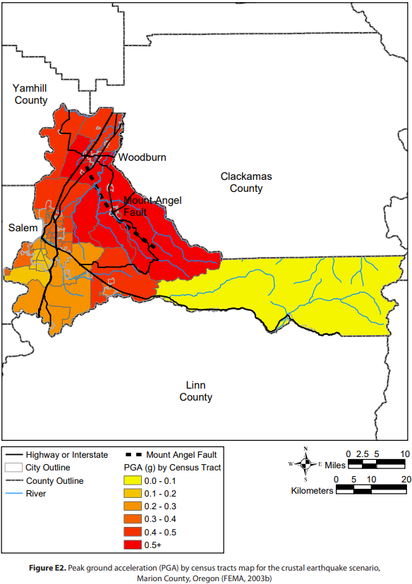 Would a crustal magnitude 6.9 Mount Angel Fault earthquake or a magnitude 8.5 Cascadia quake do more damage in Marion County? According to modeling from DOGAMI, the crustal earthquake would be more damaging; however, it would also affect a smaller geographical area than Cascadia, making the region’s overall response and recovery needs smaller. These images come from the modeled scenarios. See also, DOGAMI’s Marion County Multi-Hazard Risk Assessment Story Map. It lays out risks for earthquakes, landslides, floods, wildfires and volcanoes.