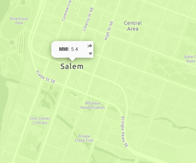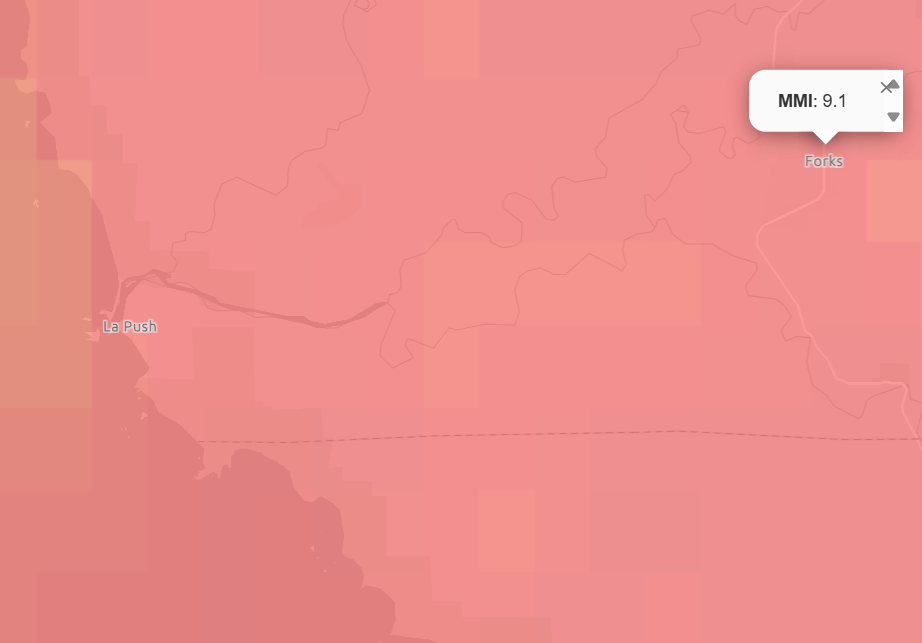Running the 2nd percentile against the 98th percentile for Forks, Washington — the location made famous by Stephenie Meyer’s Twilight books that were optioned for film — shows much higher shaking potentials than in Salem. Use the maps to zoom into areas you frequent to see what’s possible.