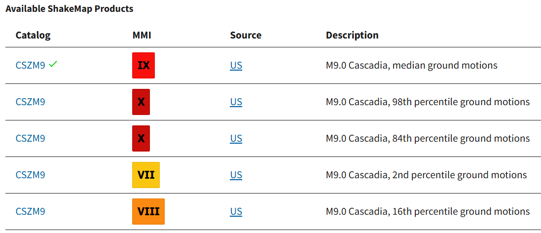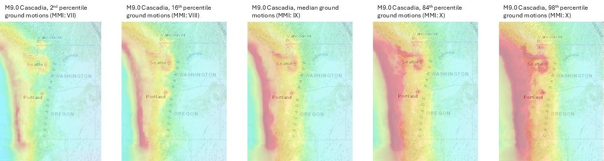 Those 30 simulations that showed the range of possibilities were compiled into a set of 5 that are available to the public. You can visit the USGS M 9.0 Scenario Earthquake – M9.0 Cascadia main page to see the map that displays median/50th percentile ground motions.