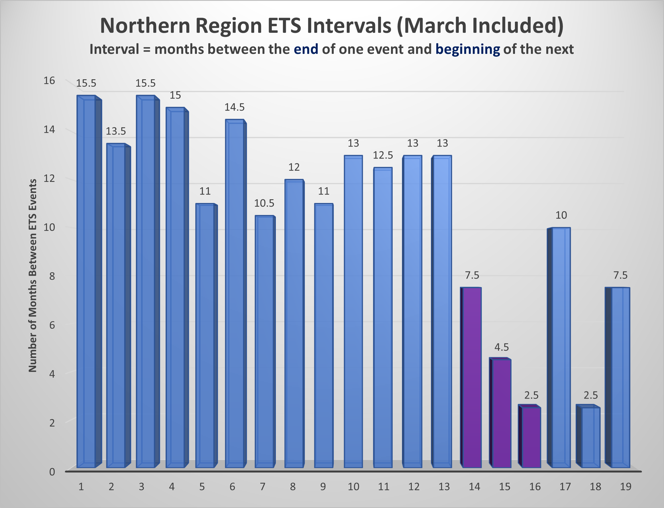 - Purple bars = 2019 activity.