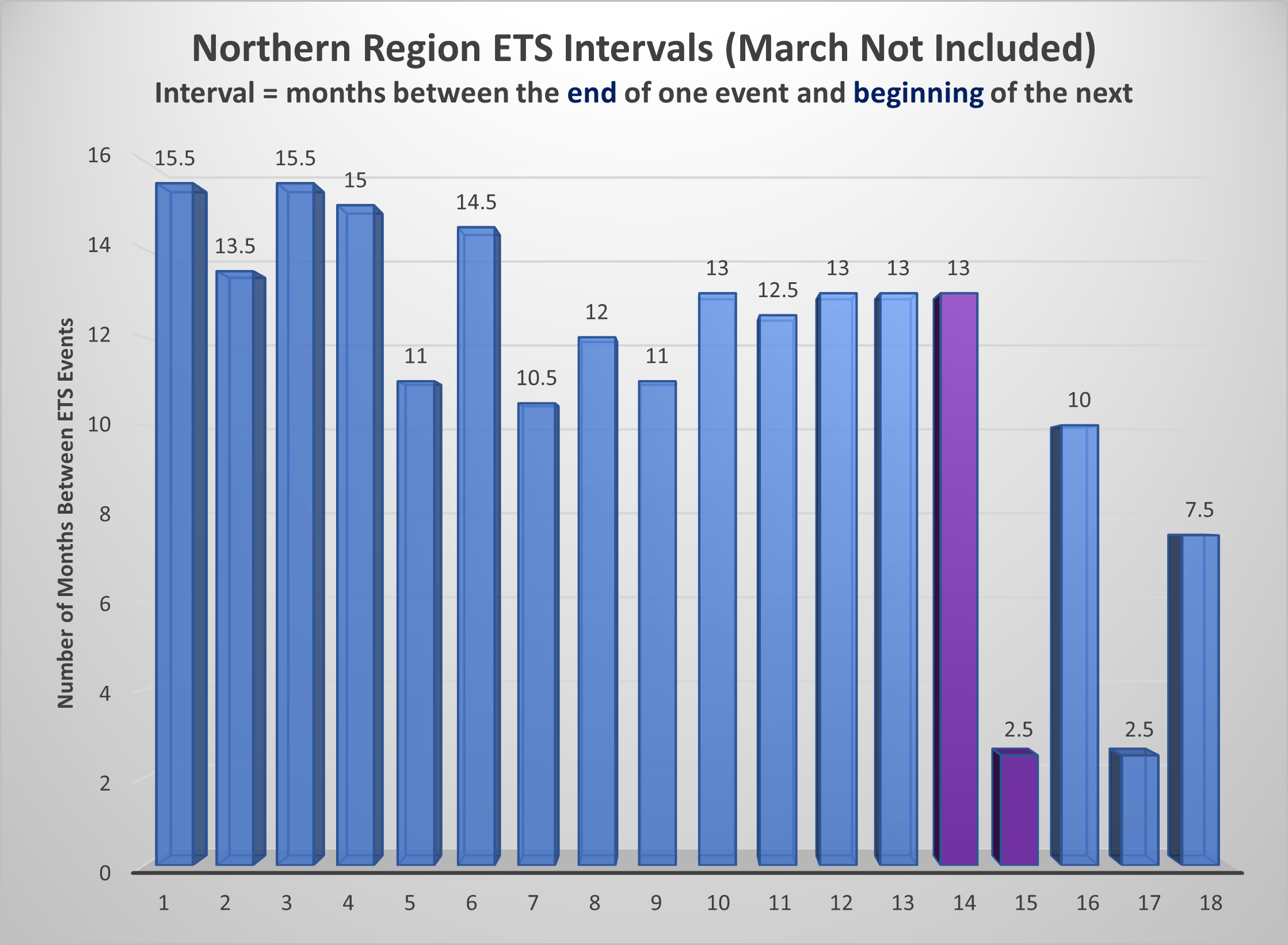 According to Merriam-Webster Dictionary, an interval is defined as “a space of time between events or states.” Oxford Dictionaries defines it as “a pause or break in activity.” This is how the charts above were made—measuring the time from the end of one slow-slip to the start of the next.