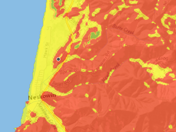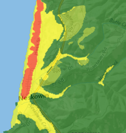 In the event of a 9.0 megathrust earthquake, residents of Neskowin will have no more than 20 minutes to get to high ground. Areas highlighted in blue — including the iconic “Proposal Rock” offshore — are expected to be submerged.
