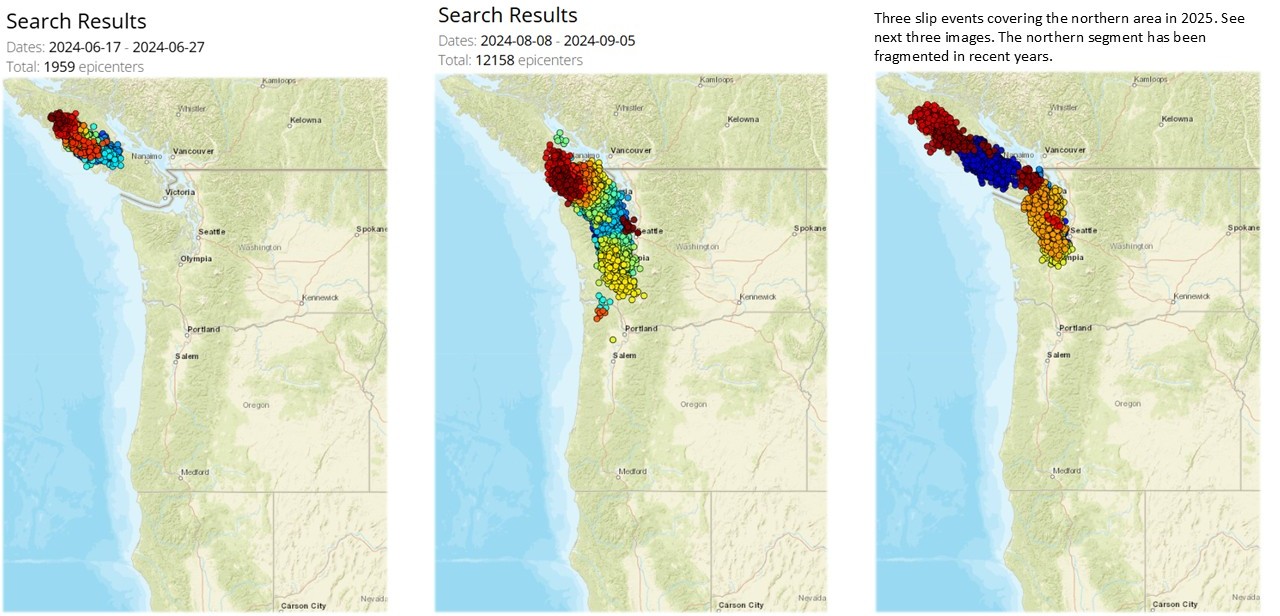 Note: A “geographic filter” was also used when compiling these images so that only the slow-slip (ETS) activity is shown on each image. This was done to (hopefully) make the slip area easier to compare from event to event.