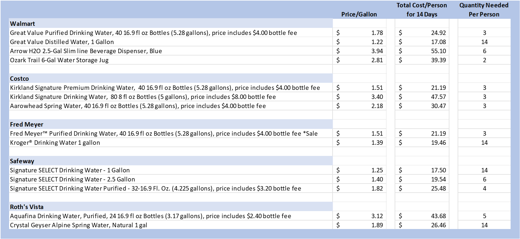 Below is an Excel table with some prices for water options at 5 stores in South Salem (May 2023). While these were some of the cheapest options, and there are many others available, this provides a rough estimate for how much it might cost for you to get 2-weeks-ready.