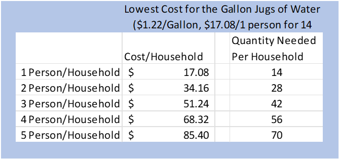 Based on the pricing from above, the total cost and quantity needed per household (up to a family of five) to be 2-weeks-ready are provided below. The jugs of water cost less, but they aren’t stackable, and you’ll need to buy more than the cases of bottled water.