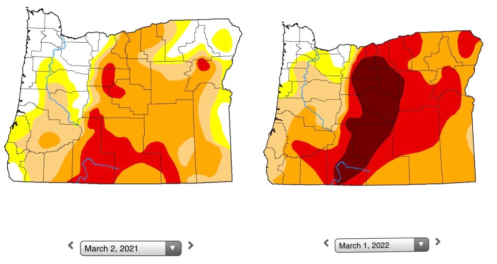 Now check out drought conditions for March of 2021 and March of 2022. Worsening conditions are evident. Fires will almost certainly again rage this summer and fall. Will easterly winds blow through the Cascades again, bringing fires toward the Willamette Valley? It’s worth being prepared. Just in case.