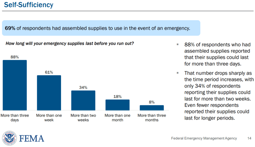 FEMA’s 2024 National Household Survey on Disaster Preparedness Findings states that over 30% of respondents said they were prepared to be self-sufficient for more than two weeks. I hope the percentage is truly that high in the Pacific Northwest.