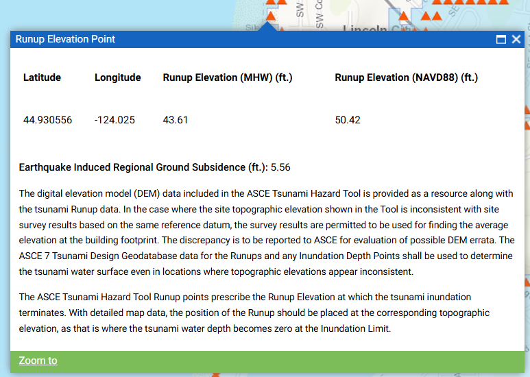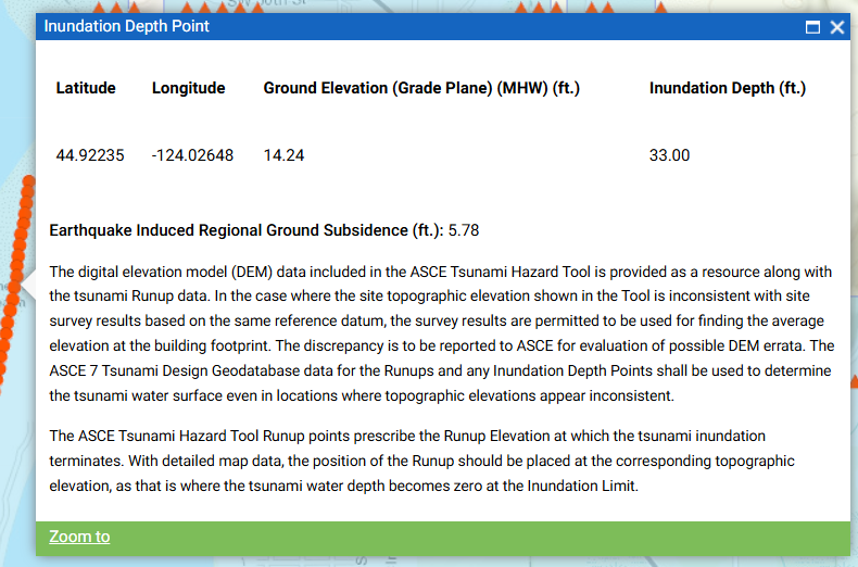To obtain current elevation levels for areas along the coast not shown under the “red dots” on the ASCE Tsunami Hazard Tool above, visit the ASCE Hazard Tool and select Tsunami as the hazard of interest for a given location. It will provide the summary report below and can provide a printable PDF.